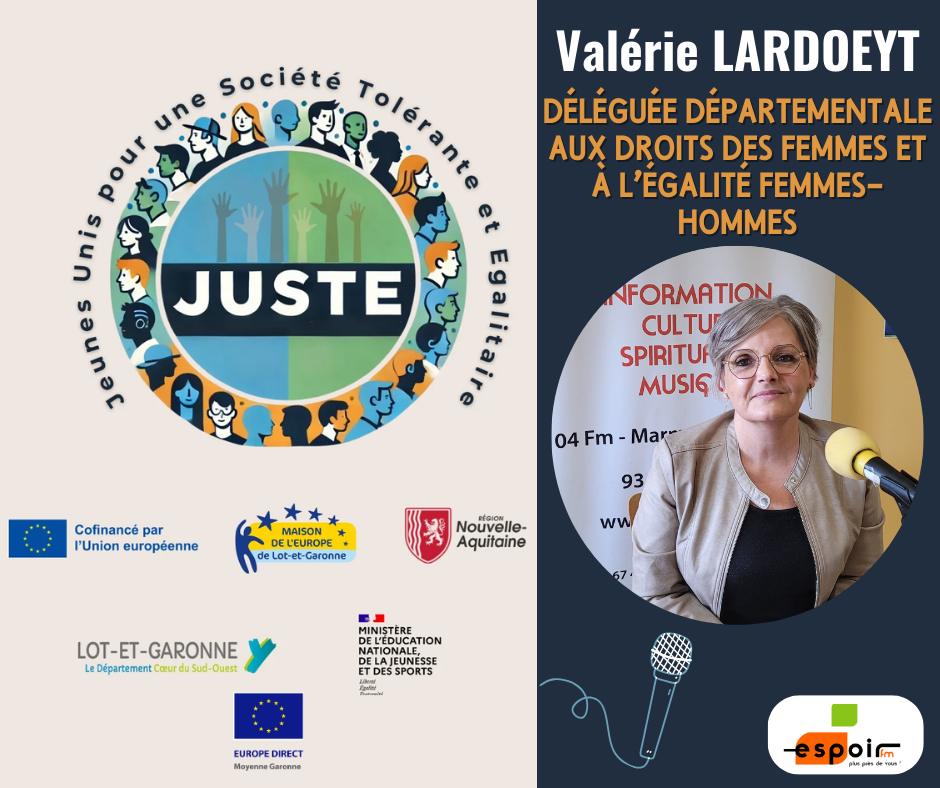 Valérie LARDOEYT est la déléguée départementale aux droits des femmes à l’égalité entre les femmes et les hommes. Elle a bien voulu nous parler des actions du département à l’occasion de sa presence à la Maison de l’Europe de lot-et-Garonne le 25 novembre dernier lors de l’Escape Game JUSTE “Jeunes Unis pour une société tolérante et égalitaire”.