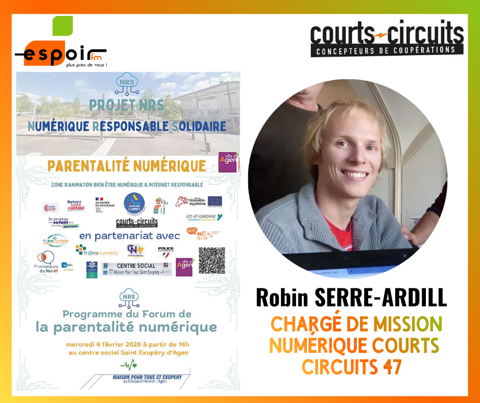 Robin SERRE-ARDILL est chargé de mission numérique à Courts-Circuits, nous présente le projet Numérique Responsable et Solidaire et les actions mises en place autour de la parentalité numérique à Agen.
