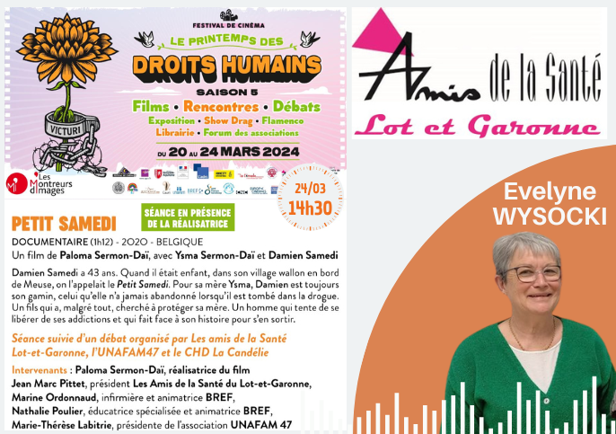 Evelyne WYSOCKI, membre des Amis de la Santé de Lot-et-Garonne. Elle présentera le ciné-débat du dimanche 24 mars proposé aux Montreurs d’Images à Agen dans le cadre du Festival « Le printemps des Droits Humains ». Émission réalisée par : Aurélie