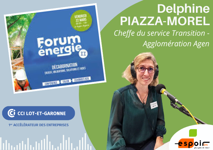Delphine PIAZZA-MOREL, cheffe de service Transition Environnementale à l’agglomération d’Agen. Lors de notre rencontre au Forum Energie de la CCI47, elle nous détaille les enjeux de la décarbonation. Émission réalisée par : Aurélie