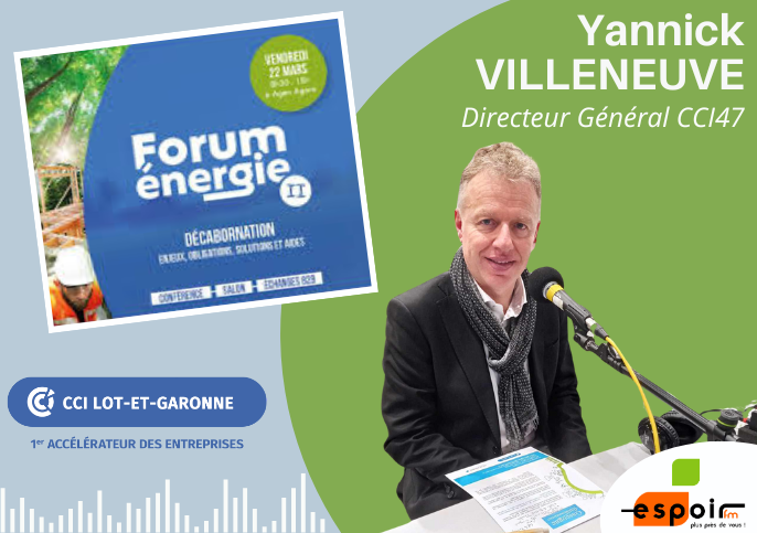 Yannick VILLENEUVE, directeur général de la Chambre de Commerce et d’Industrie de Lot-et-Garonne. Il explique pourquoi et comment la CCI47 est présente aux côtés des entreprises sur les sujets de transition écologique. Émission réalisée par : Aurélie