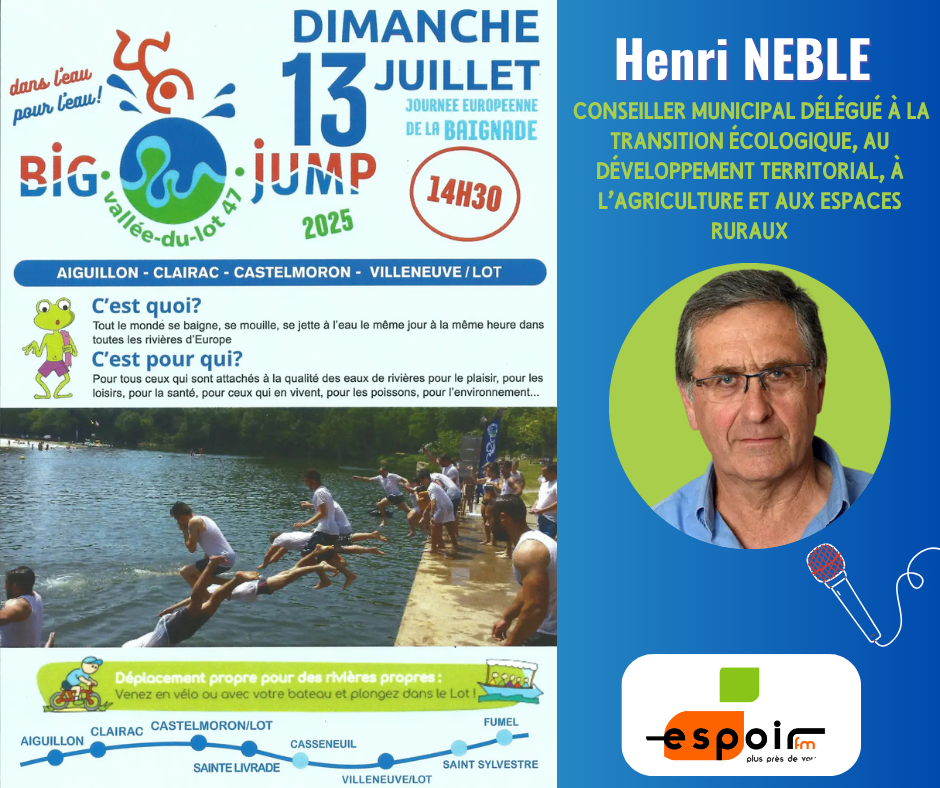 Henri Neble est conseiller municipal à Aiguillon en charge de la plage. Il nous présente le programme du Big Jump qui se tiendra ce dimanche 13 juillet. L’occasion de célébrer la journée européenne de la baignade en rivière. Émission réalisée par : Aurélie