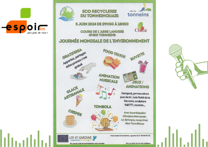 Pascal Loubatéry, l’un des fondateurs de l’écorecyclerie de Tonneins. Il nous parle de la fête organisée le 5 juin à l’occasion de la journée mondiale de l’environnement. Une gratiféria, des animations et jeux, buvette et food truck à Tonneins. Émission réalisée par : Emmanuelle