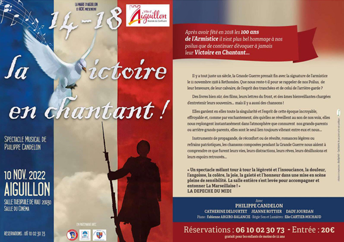 Philippe Candelon est chanteur, comédien, auteur, compositeur, metteur en scène Il présente son spectacle « 14-18 la victoire en chantant » à voir à Aiguillon, Aquitaine, France ce 10 Novembre à 20h30. Emission réalisée par : Aurélie